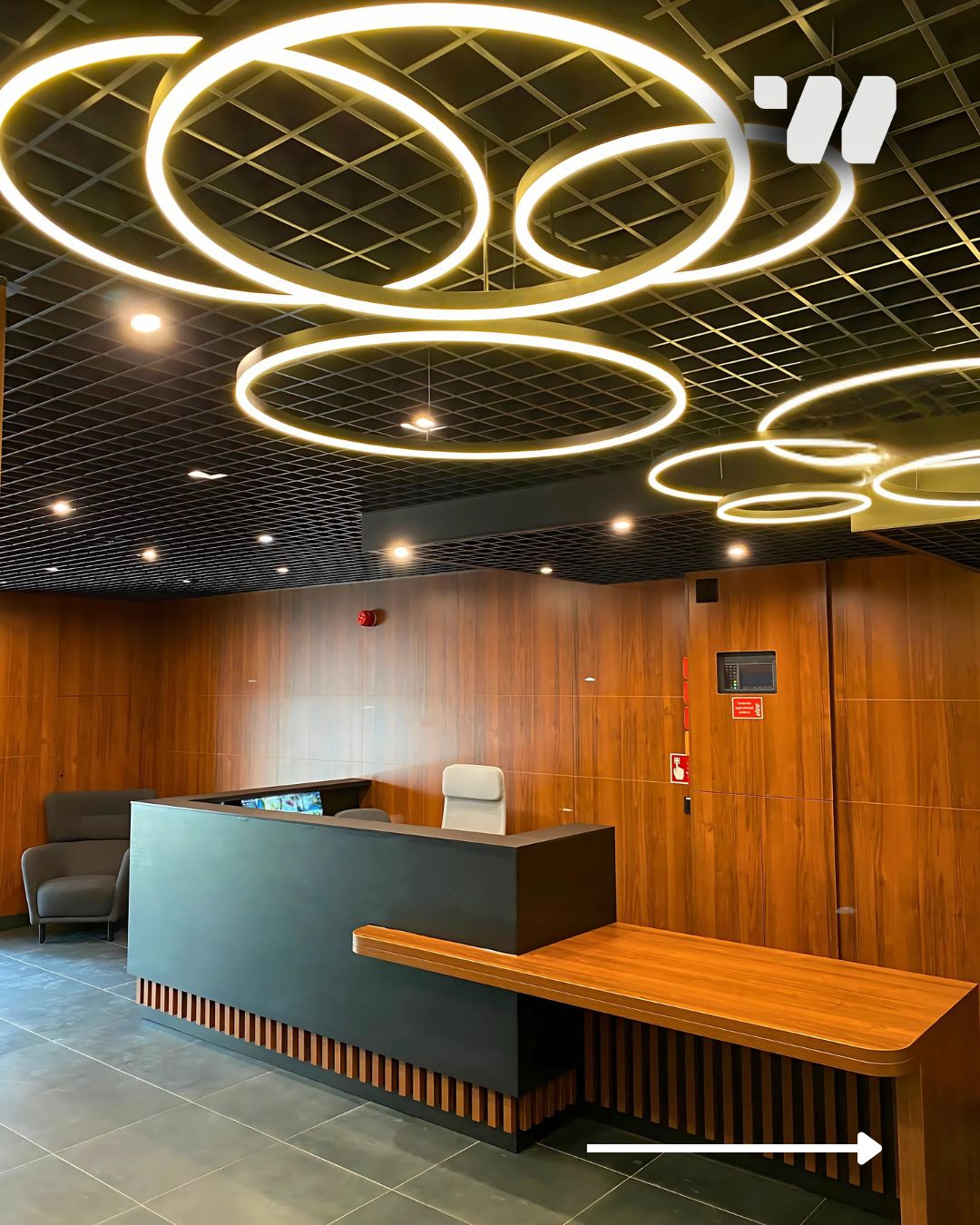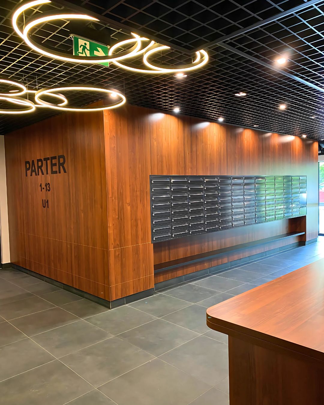 Duże wrażenie robi indywidualnie zaprojektowane, reprezentacyjne lobby wejściowe, wykończone materiałami wysokiej jakości.